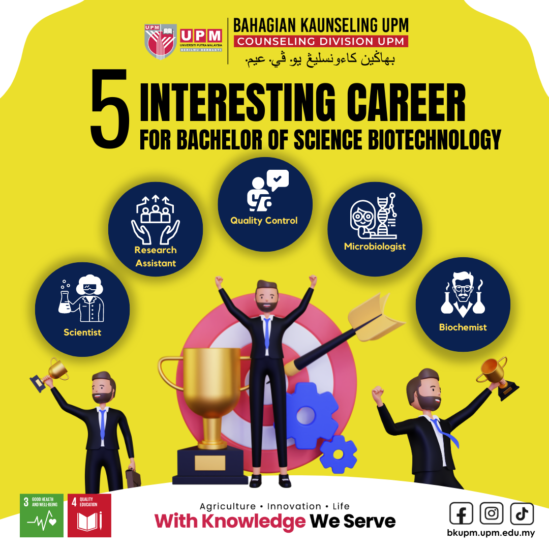 First of all, brothers/sisters need to be clear with the career focus for this field of biotechnology. A career in biotechnology is very important to support the improvement and development of various industries in Malaysia including agriculture, animal husbandry, food, medicine, manufacturing and also waste management. This is in line with the National Biotechnology Policy 2005-2020 to develop the field of biotechnology as one of the engines of economic growth. This policy focuses on the development of three economic sectors namely agriculture, health care and industrial manufacturing, as well as supporting the development of the scientific, academic and business community ecosystem (Source: Website of the Faculty of Biotechnology & Biomolecular Sciences)