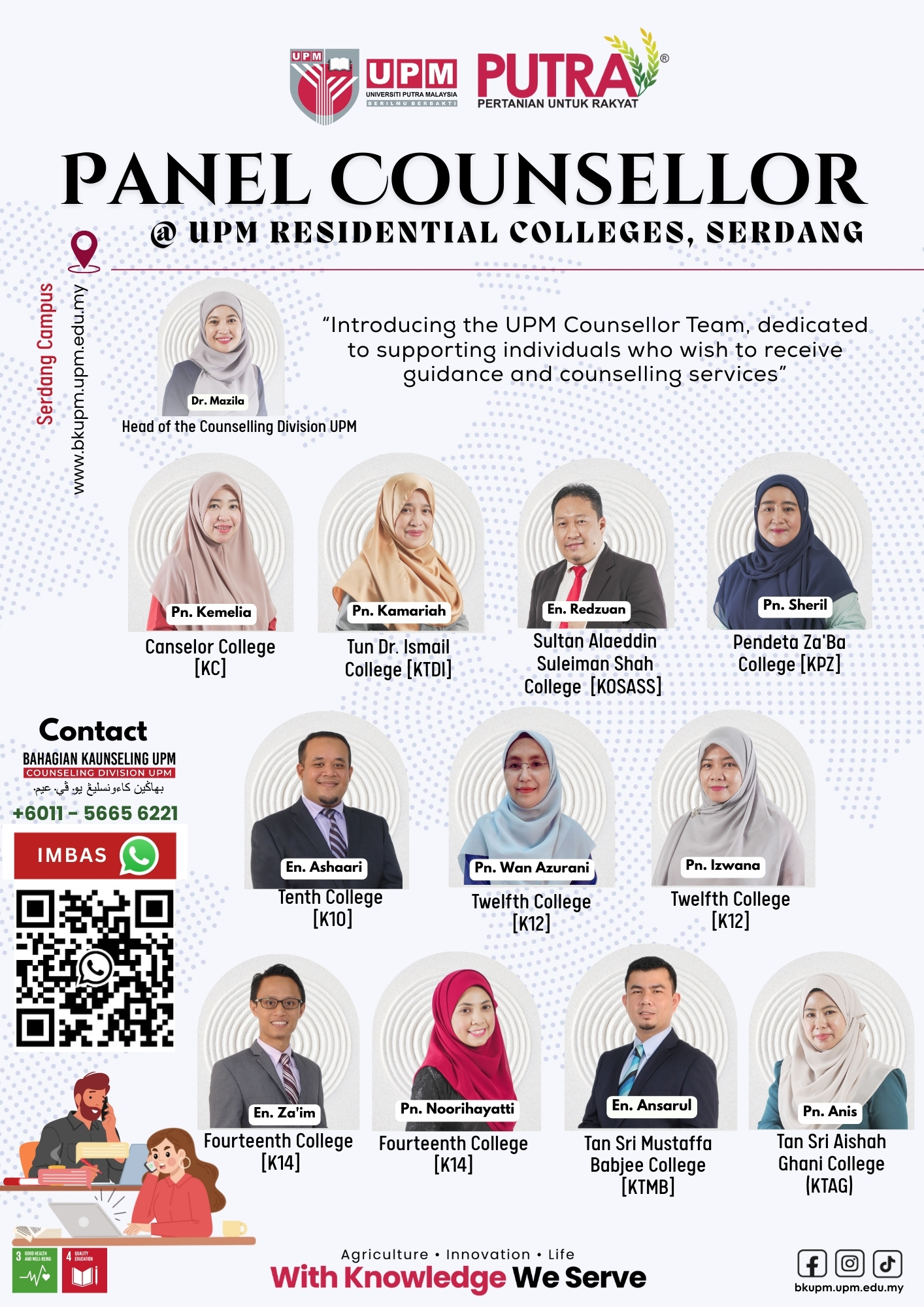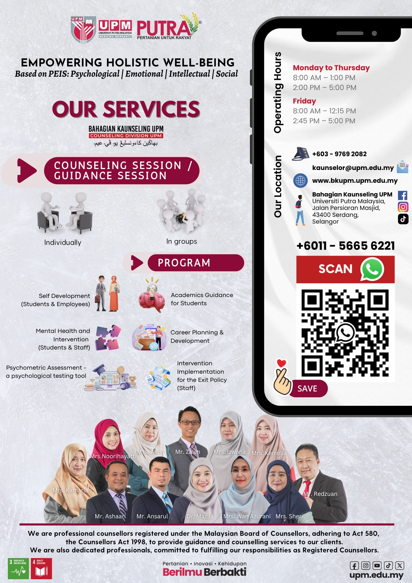 The UPM Counselling Unit offers a variety of services specially designed for both UPM students and staff.Come visit us at the Counselling Unit to find out more!